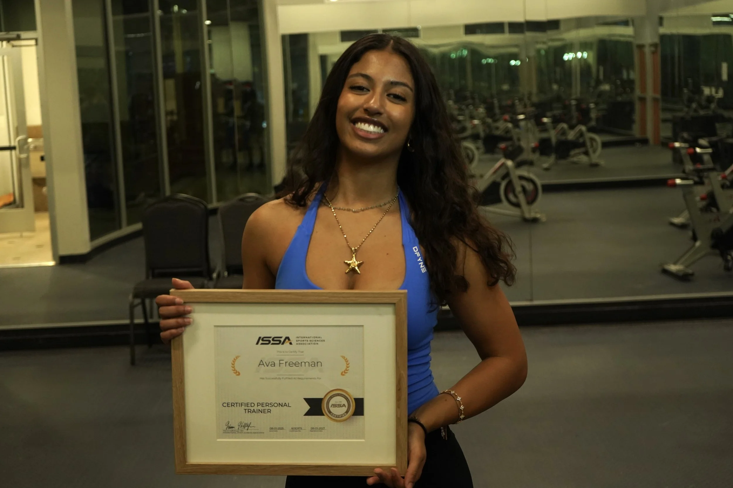 A woman with long, wavy dark hair and a bright smile holding a framed certificate in a gym. She is wearing a blue athletic top and gold jewelry, including a starfish pendant necklace.