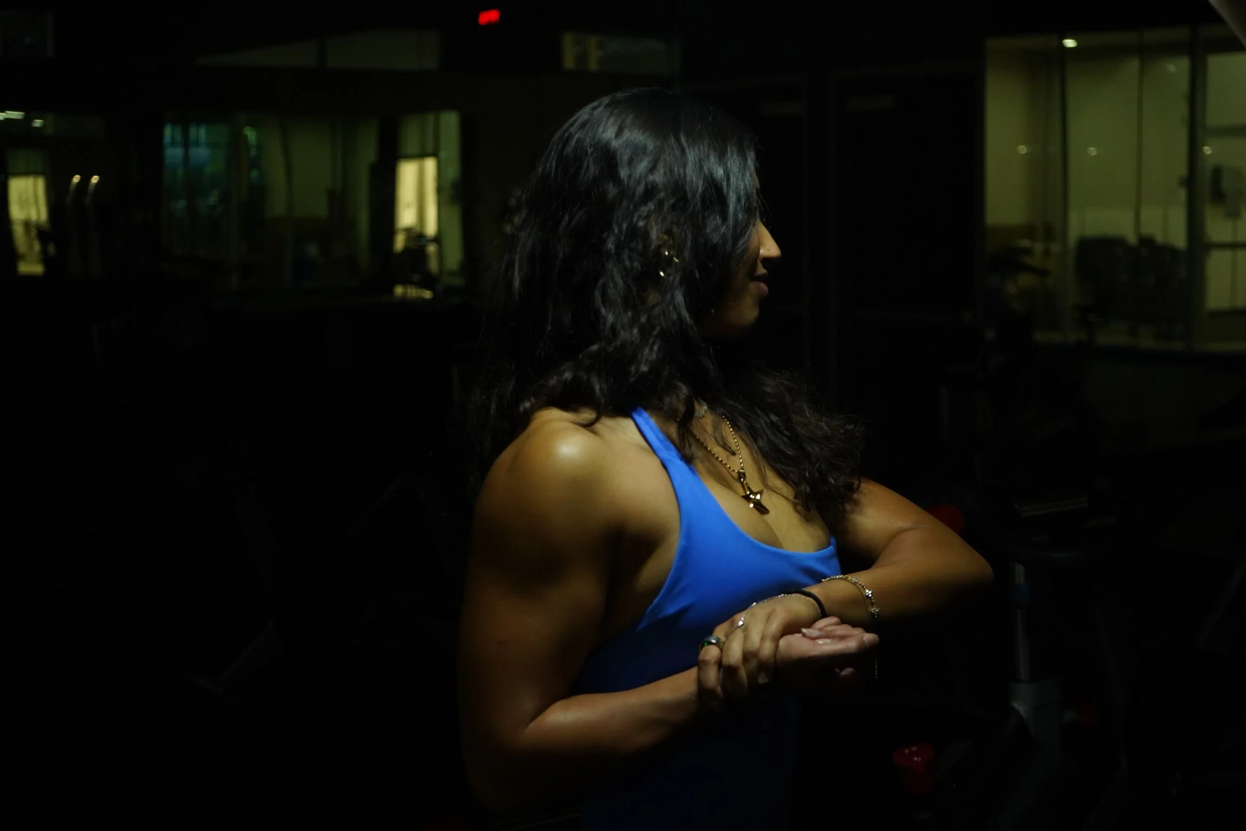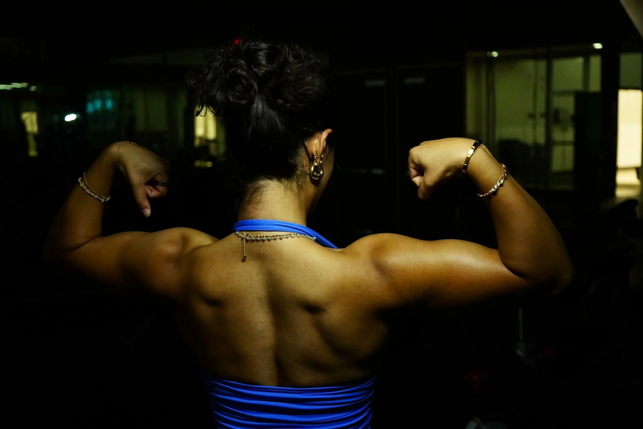 Back view of a woman flexing her biceps in a gym, wearing a blue sports top, with jewelry and dark hair in an updo.
