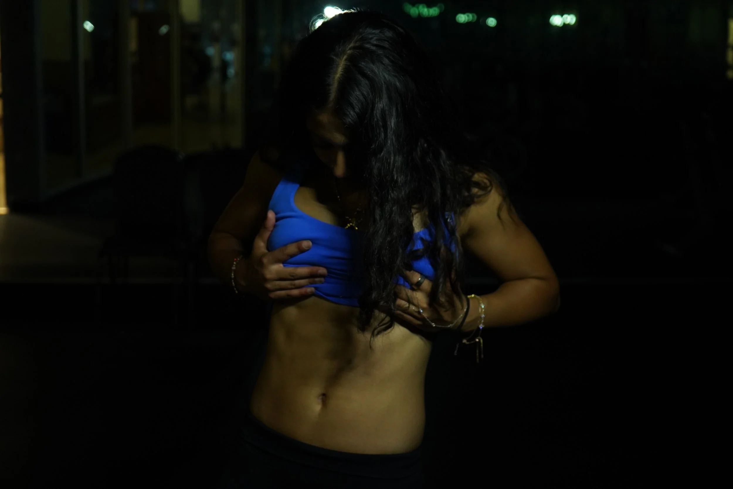 A woman with long dark hair, wearing a blue top and black pants, is adjusting or lifting her top to reveal her midriff in a dimly lit setting.